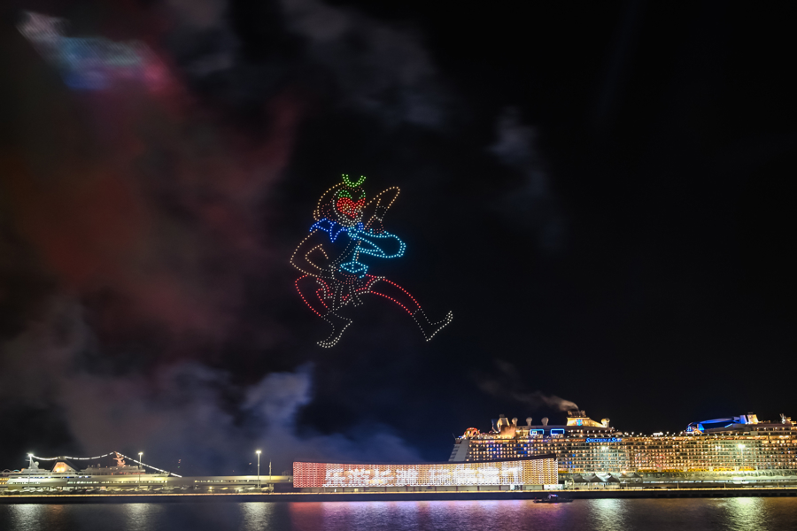 作为第二届上海国际光影节宝山分会场活动之一,“吴淞口空中剧场”将中国动画IP《哪吒闹海》《大闹天宫》与无人机编队、数字光影、烟花爆破等前沿技术深度融合。10月1日晚,周边居民、江边游人、商场消费者和酒店住客无不举起手机拍照录像,共庆祖国华诞。当天恰逢爱达魔都号和皇家加勒比海洋光谱号两艘大型邮轮停靠在吴淞口国际邮轮港,一万余名游客和船员也近距离观赏了齐天大圣在宝山滨江闹“天宫”的精彩画面。